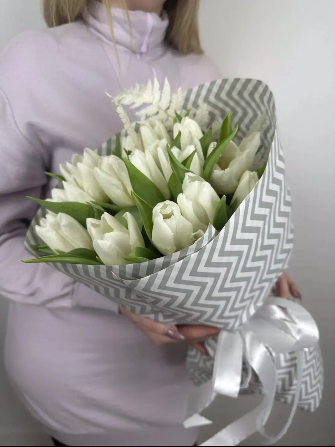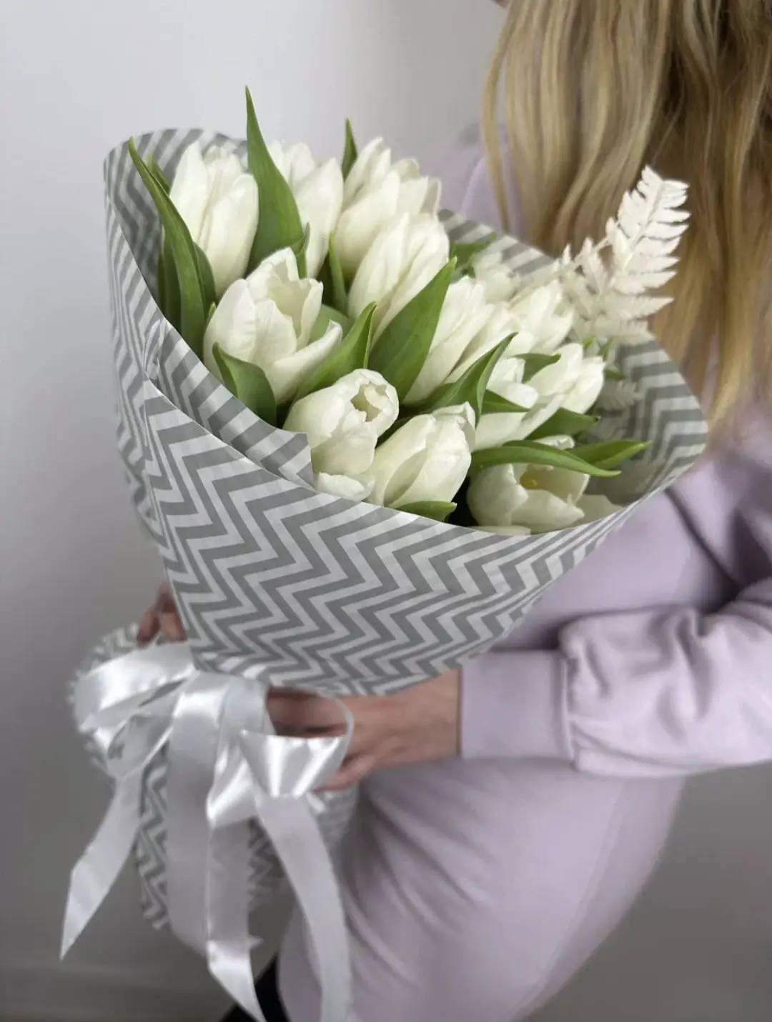 Букет живых цветов из 15 Белых тюльпанов в дизайнерской упаковке — купить по цене от 3732 руб. с доставкой в Дзержинске