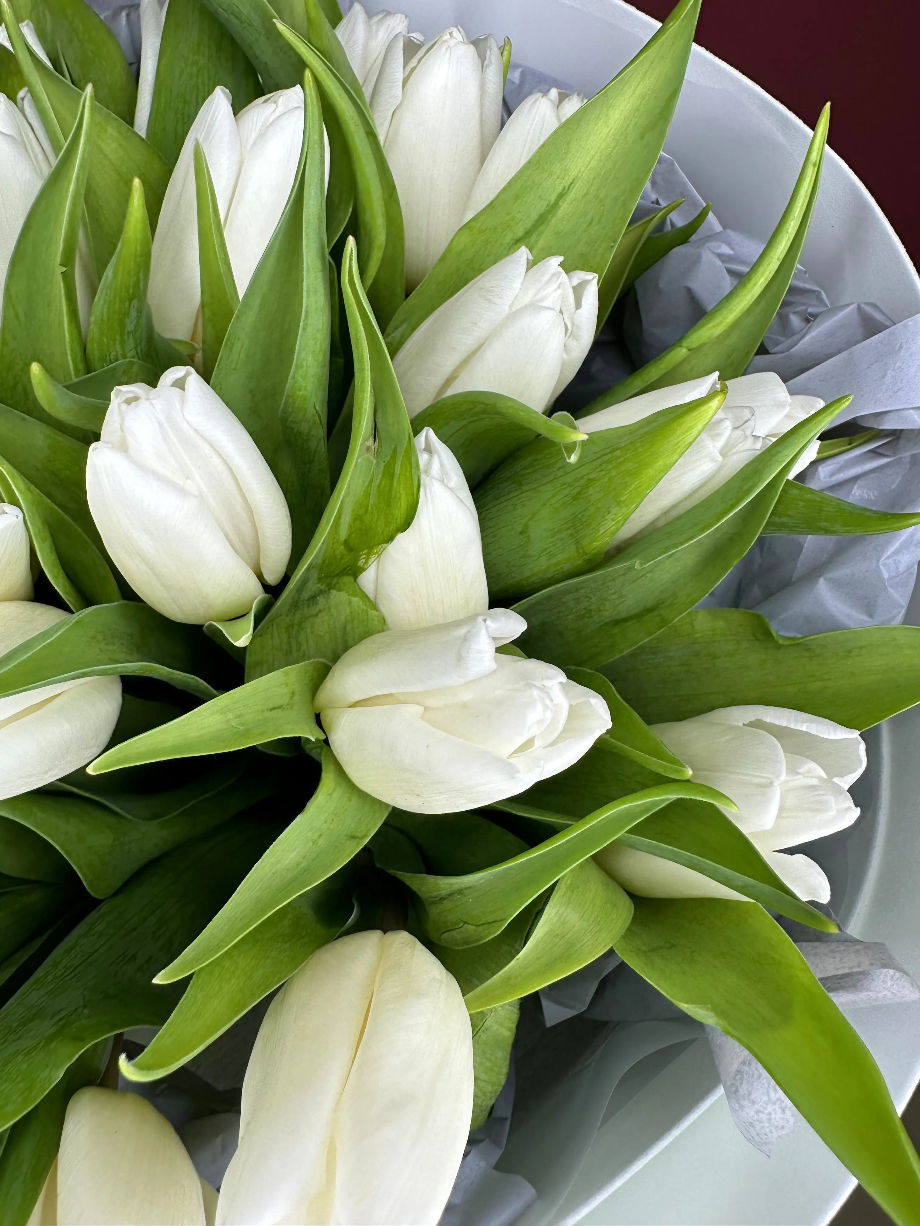 Букет живых цветов из 21 Белого тюльпана в дизайнерской упаковке — купить по цене от 5011 руб. с доставкой в Дзержинске