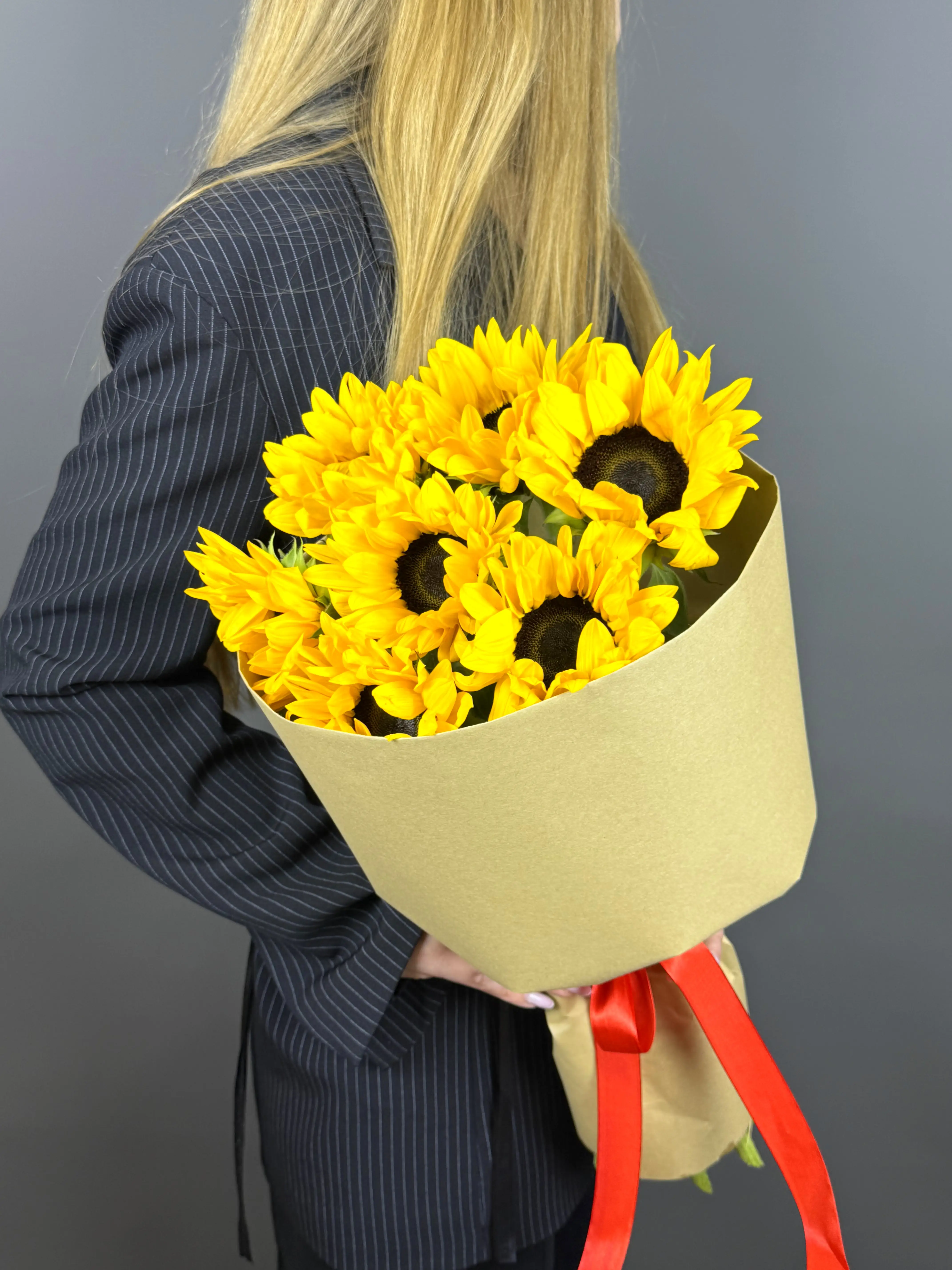 Букеты живых цветов "Солнечный" из подсолнухов в дизайнерской упаковке