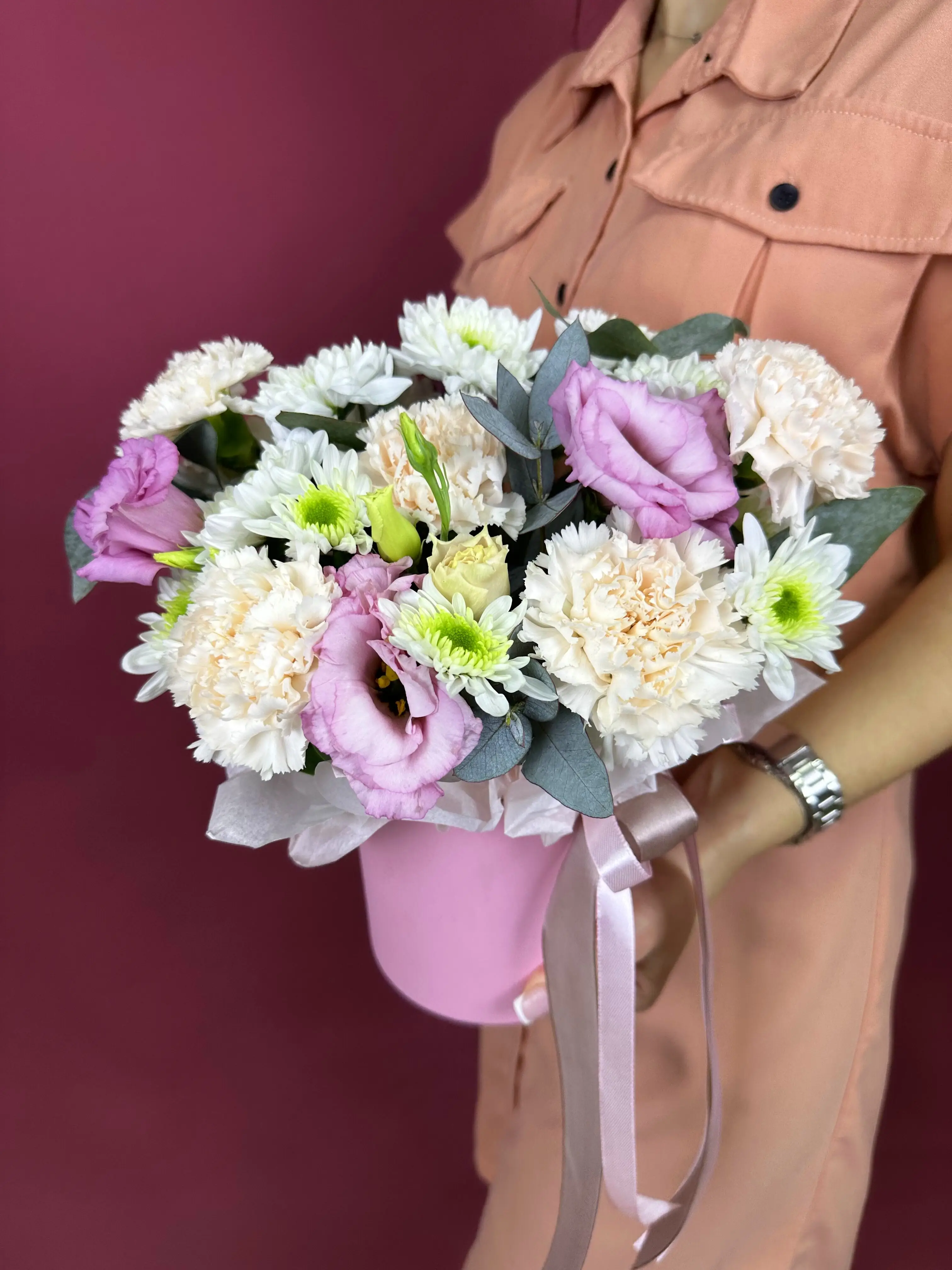Букет живых цветов с гвоздикой и розовой эустомой в нежной шляпной коробке