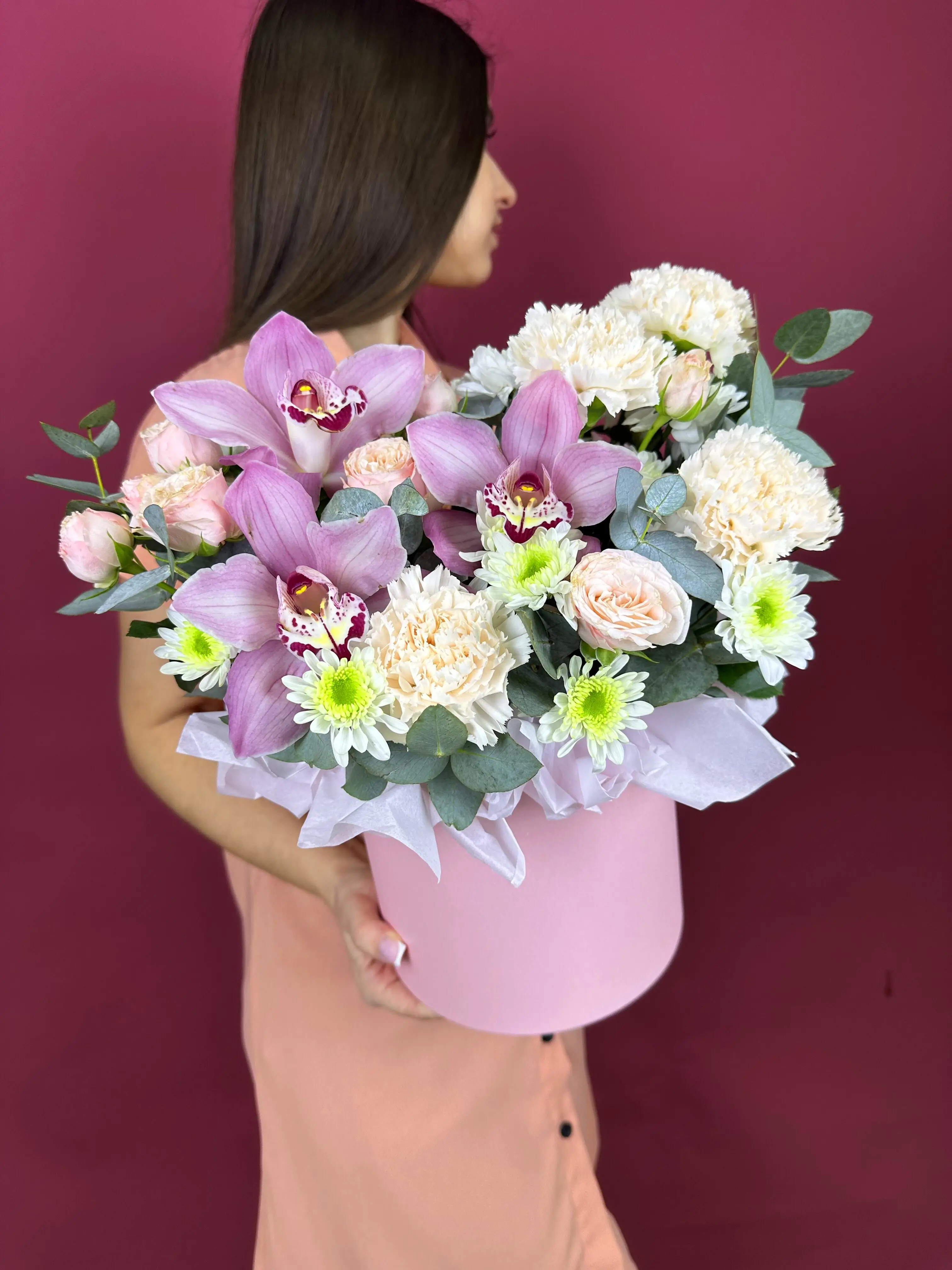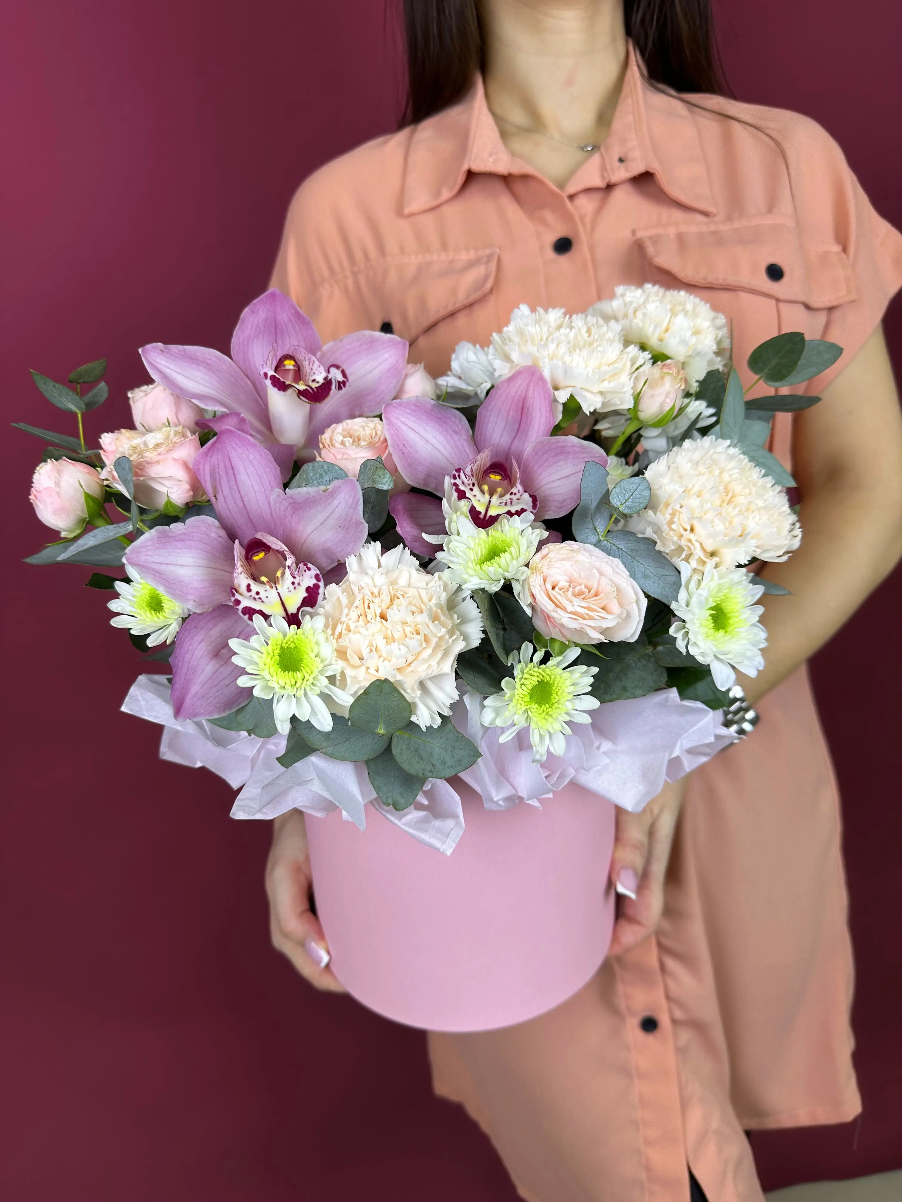 Букет живых цветов с орхидеями и нежными розами в шляпной коробке