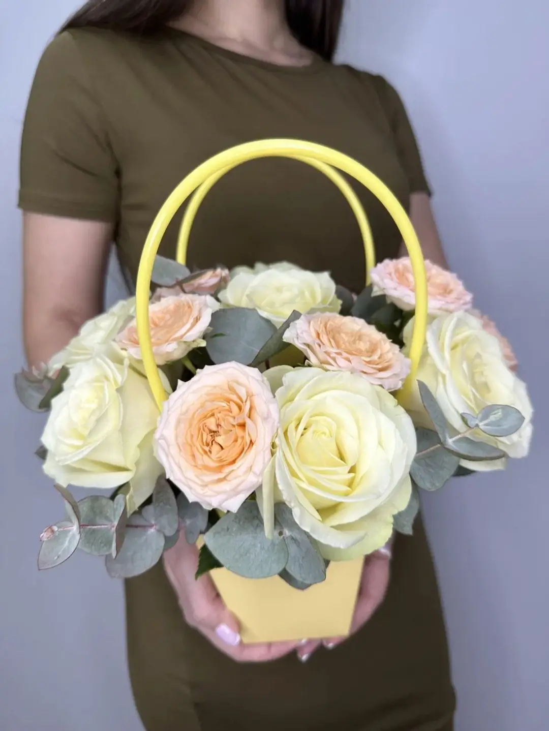 Букет живых цветов с белоснежными розами в красивой нежной сумочке — купить по цене от 2065 руб. с доставкой в Дзержинске