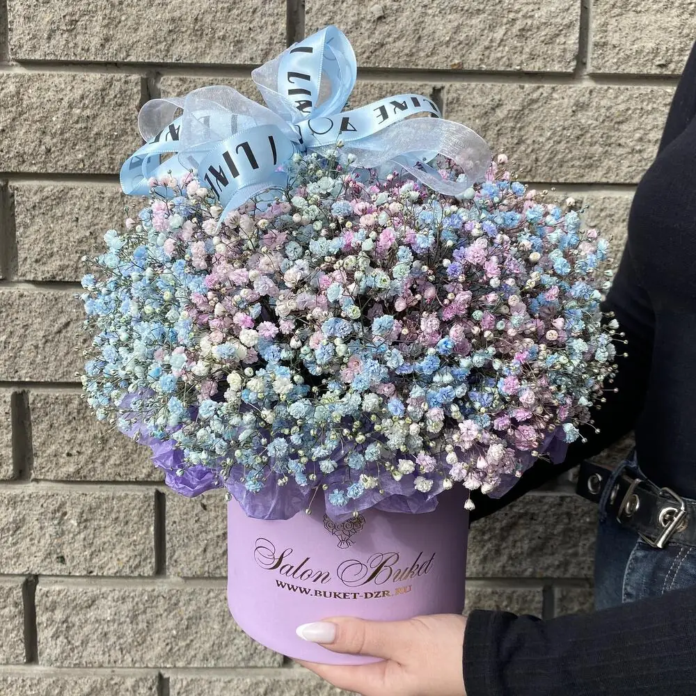 Букет живых цветов из радужной гипсофилы в нежной шляпной коробке — купить по цене от 3097 руб. с доставкой в Дзержинске