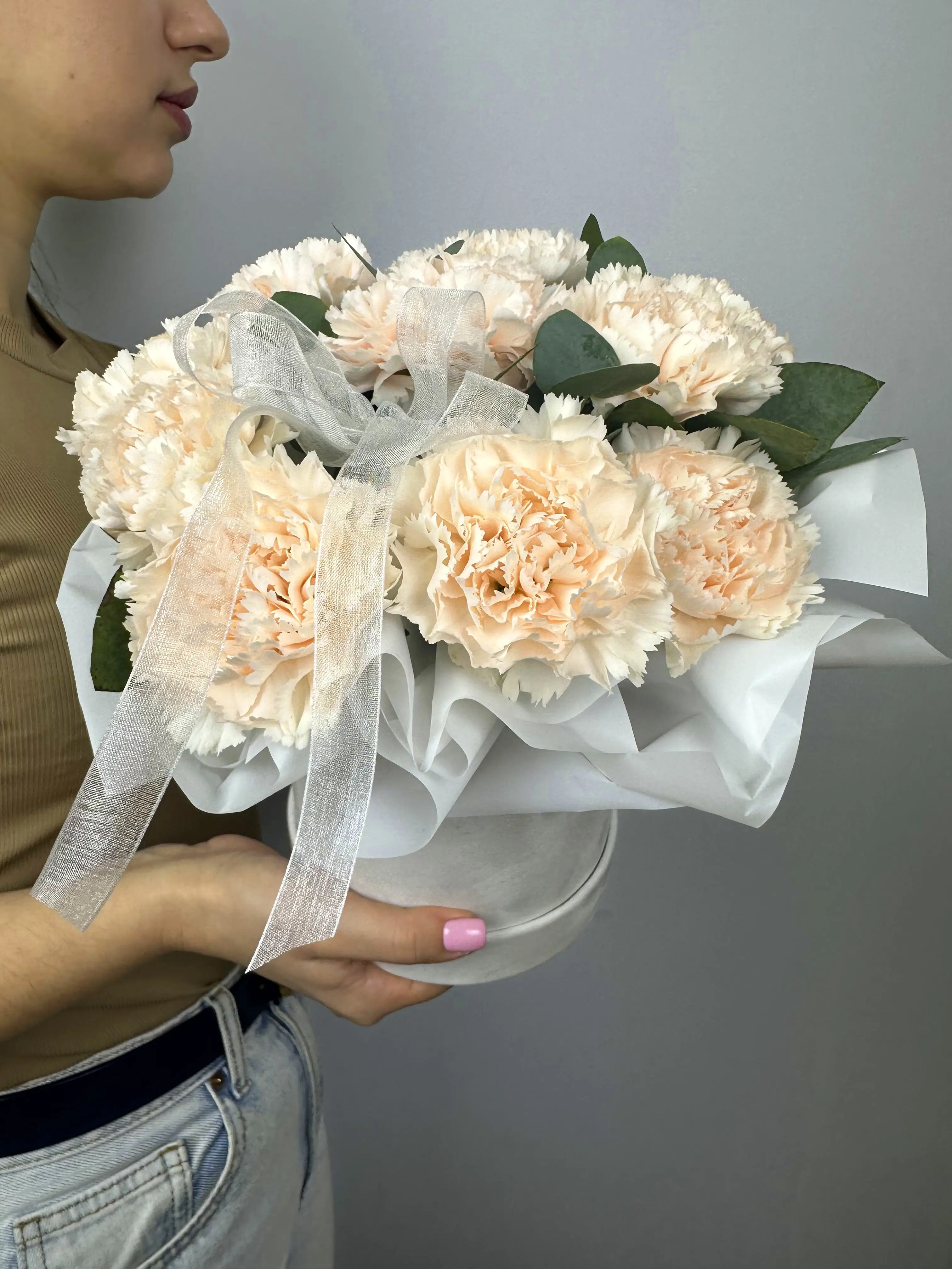 Букет живых цветов из нежных диантусов в белоснежной шляпной коробке