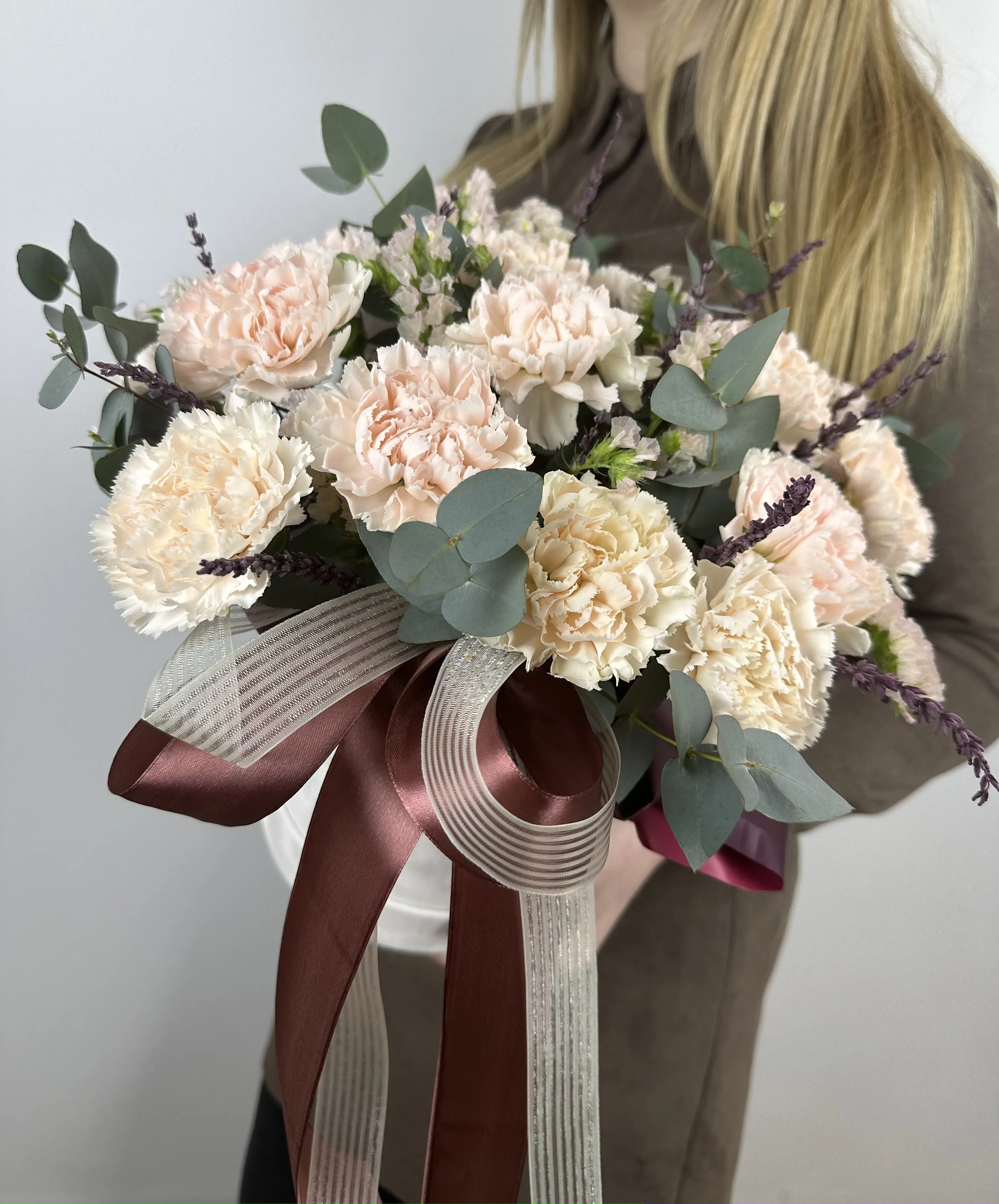Букет живых цветов с кружевными диантусами в шляпной коробке — купить по цене от 3821 руб. с доставкой в Дзержинске